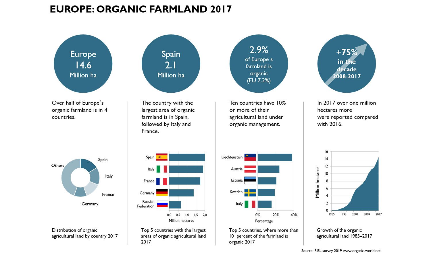 Con 2,1 millones de hectáreas, España sigue siendo el país con la mayor superficie ecológica de Europa, seguida de Italia (1,9 millones de hectáreas) y Francia (1,7 millones de hectáreas), según los datos de 2017 del sector orgánico europeo presentados en BIOFACH, la feria líder mundial de alimentos ecológicos, y recogidos por la Sociedad Española de Agricultura Ecológica (SEAE). Destacan que en Europa, 14.6 millones de hectáreas son ecológicas (en la Unión Europea, 12.8 millones de hectáreas).