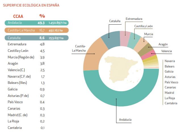 A pesar de esta circunstancia, el arco mediterráneo español destaca por la superficie agraria que destinan a la producción ecológica, despuntando especialmente Andalucía y Murcia con más del 30%. Le siguen Cataluña y Baleares, ambas con un 23% SAU eco. En un tercer bloque se encuentran, con entre un 12 y 13% de SAU eco, Navarra, Castilla-La Mancha y Comunidad Valenciana.