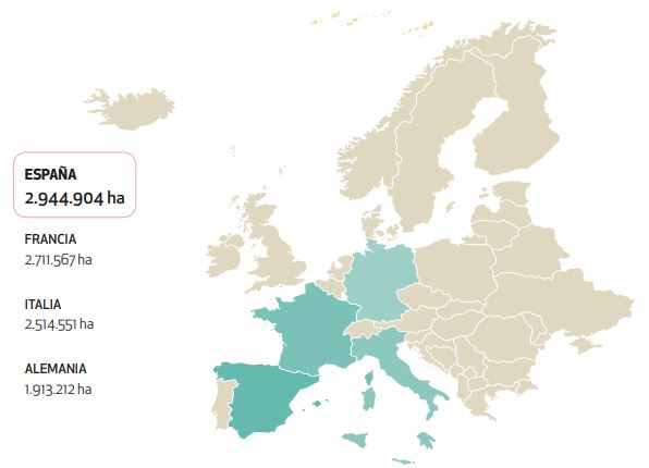 Con el ritmo actual de crecimiento, esta meta resulta prácticamente inalcanzable sin una intervención política de gran alcance en los próximos años. En términos prácticos, alcanzar dicho objetivo exigiría medidas de apoyo de una escala inédita hasta ahora en el sector agrario europeo. En este contexto comunitario, España mantiene su posición de liderazgo, con cerca de tres millones de hectáreas certificadas en ecológico, lo que representa alrededor del 15% de toda la superficie ecológica europea, por delante de Francia, Italia y Alemania.
