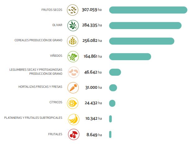 Los principales cultivos ecológicos siguen siendo los frutos secos, con una superficie total cultivada de 307.059 hectáreas, seguidos del olivar, con 284.335 hectáreas y los cereales, con 256.082 hectáreas. En total, estos tres cultivos representativos de la zona agroclimática mediterránea suman juntos el 66% del total de la superficie cultivada eco del país.