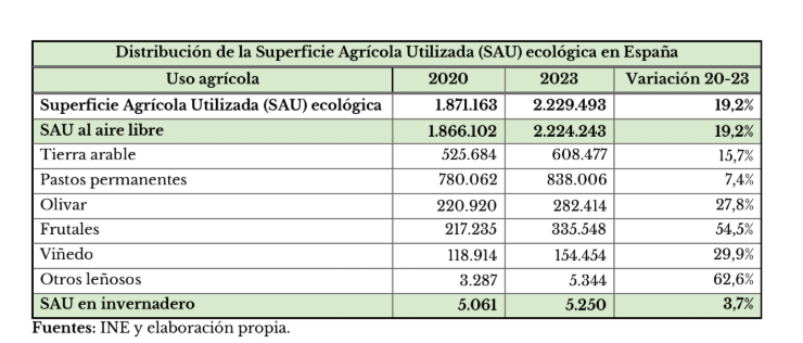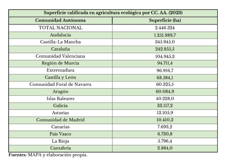 De acuerdo con los datos del Ministerio de Agricultura, Pesca y Alimentación (MAPA), la superficie calificada en producción ecológica superó en 2023 los 2,44 millones de hectáreas, cifra que incluye los terrenos forestales con carga ganadera o pecoreo, que no forman parte de la SAU. A estas se suman más de 700.000 hectáreas en proceso de conversión.