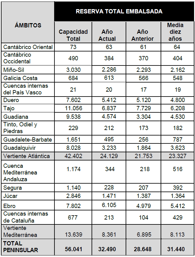 La situación de las cuencas en hectómetros cúbicos está detallada a continuación: