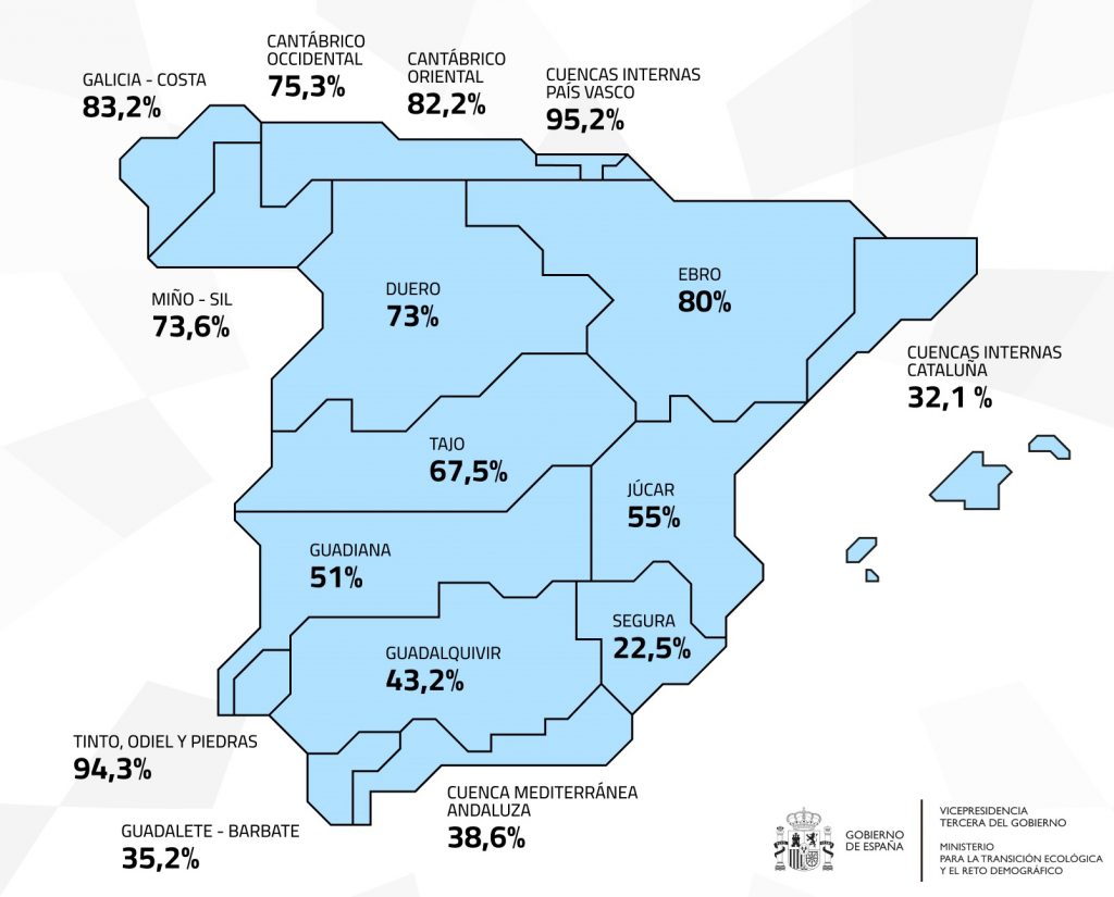 La reserva hídrica se encuentra al 60,9% de su capacidad total, según los datos publicados por el Ministerio para la Transición Ecológica y el Reto Demográfico (MITECO). Debido a las lluvias de los últimos días, ha aumentado en 1.614 hectómetros cúbicos (el 2,9% de la capacidad total actual de los embalses).