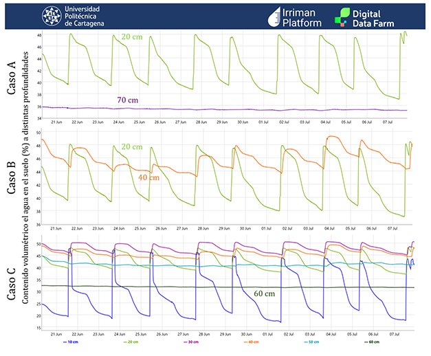En cambio, en un tercer caso, mediante la monitorización cada 10 cm entre 10 y 60 cm en el suelo permitió monitorizar de forma continua la dinámica vertical del agua en el perfil.