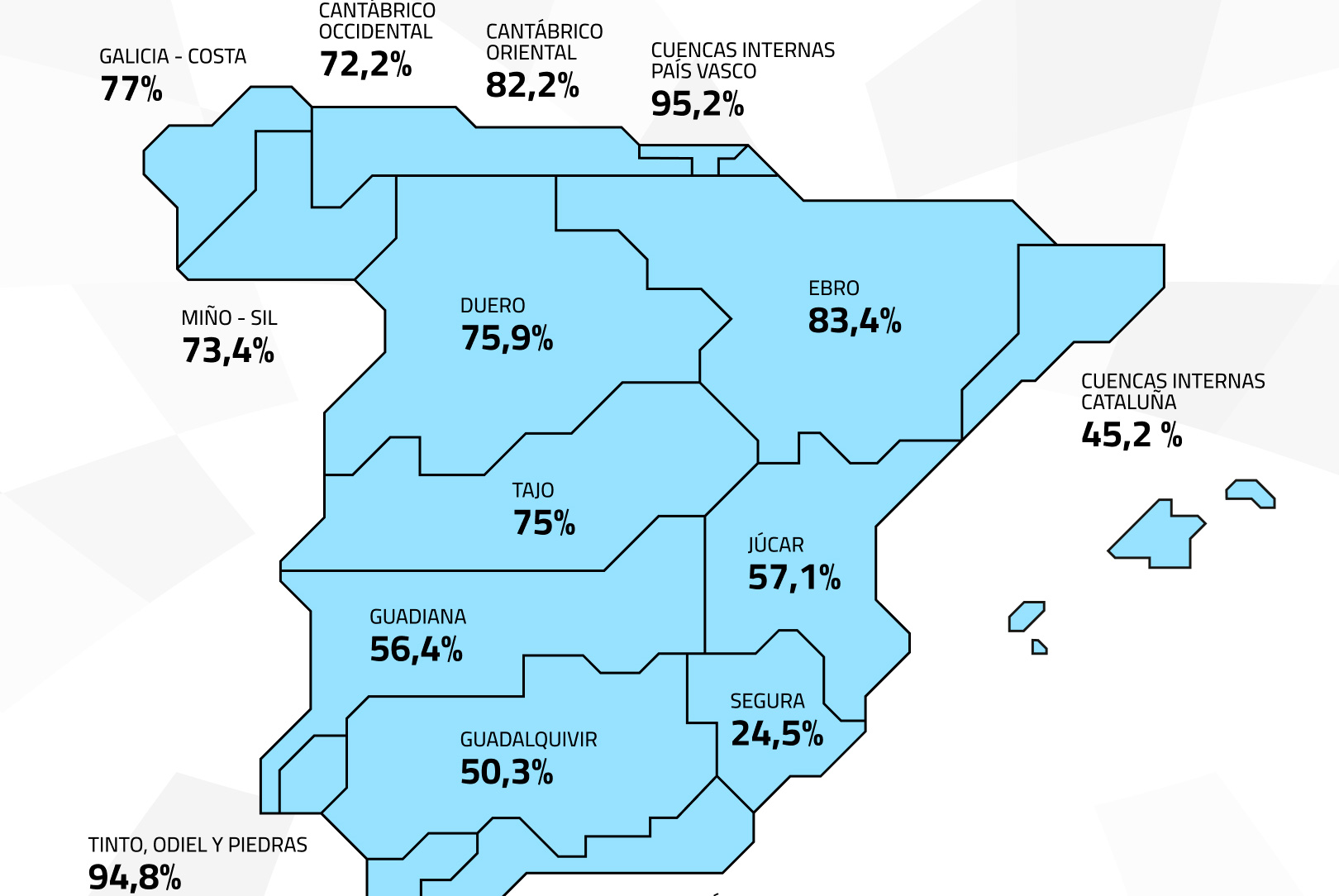 Los embalses almacenan actualmente 36.867 hectómetros cúbicos (hm³) de agua, lo que significa que en la última semana las reservas han aumentado en 2.751 hectómetros cúbicos (el 4,9% de la capacidad total actual de los embalses).