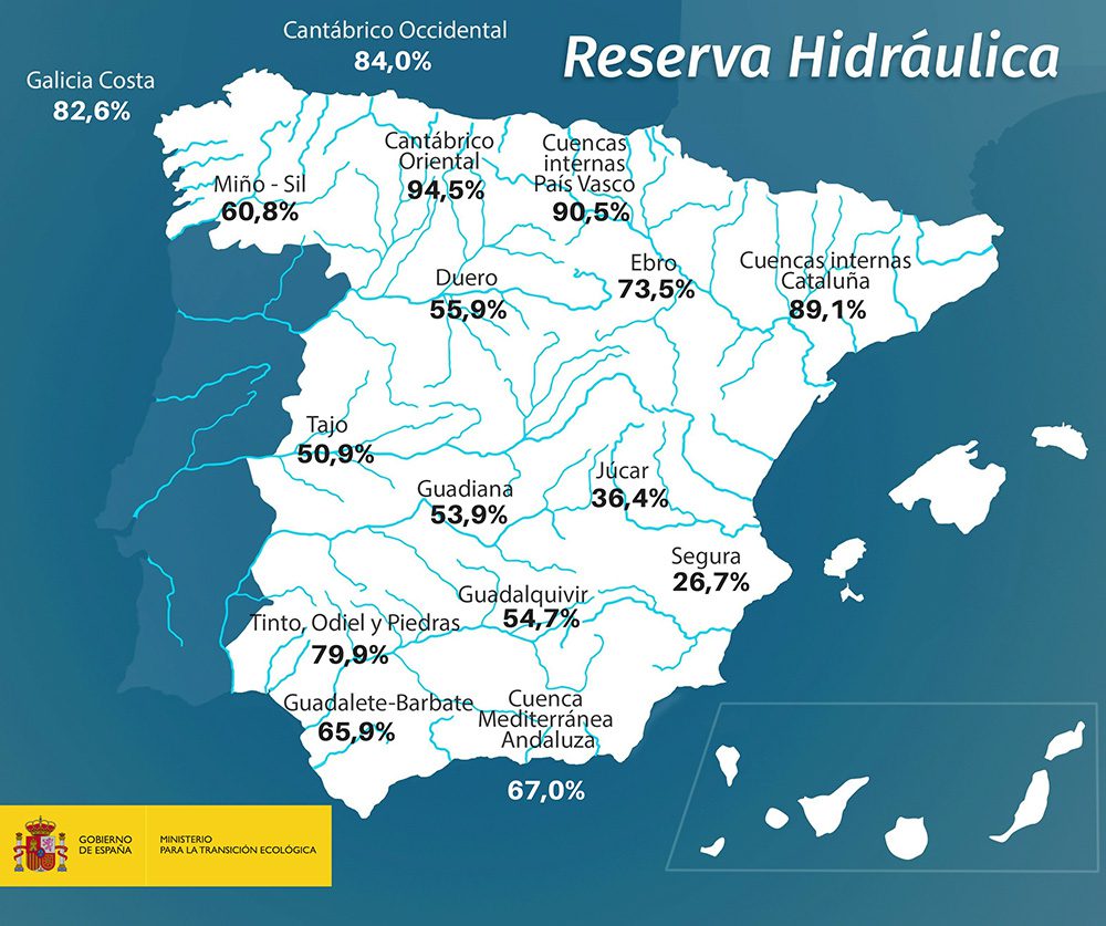 Con respecto a la reserva hidráulica española, hoy se encuentra al 57% de su capacidad total. Los embalses almacenan actualmente 31.982 hectómetros cúbicos de agua, aumentando en la última semana en 1.264 hm³, lo que supone el 2,3% de la capacidad total de los embalses.