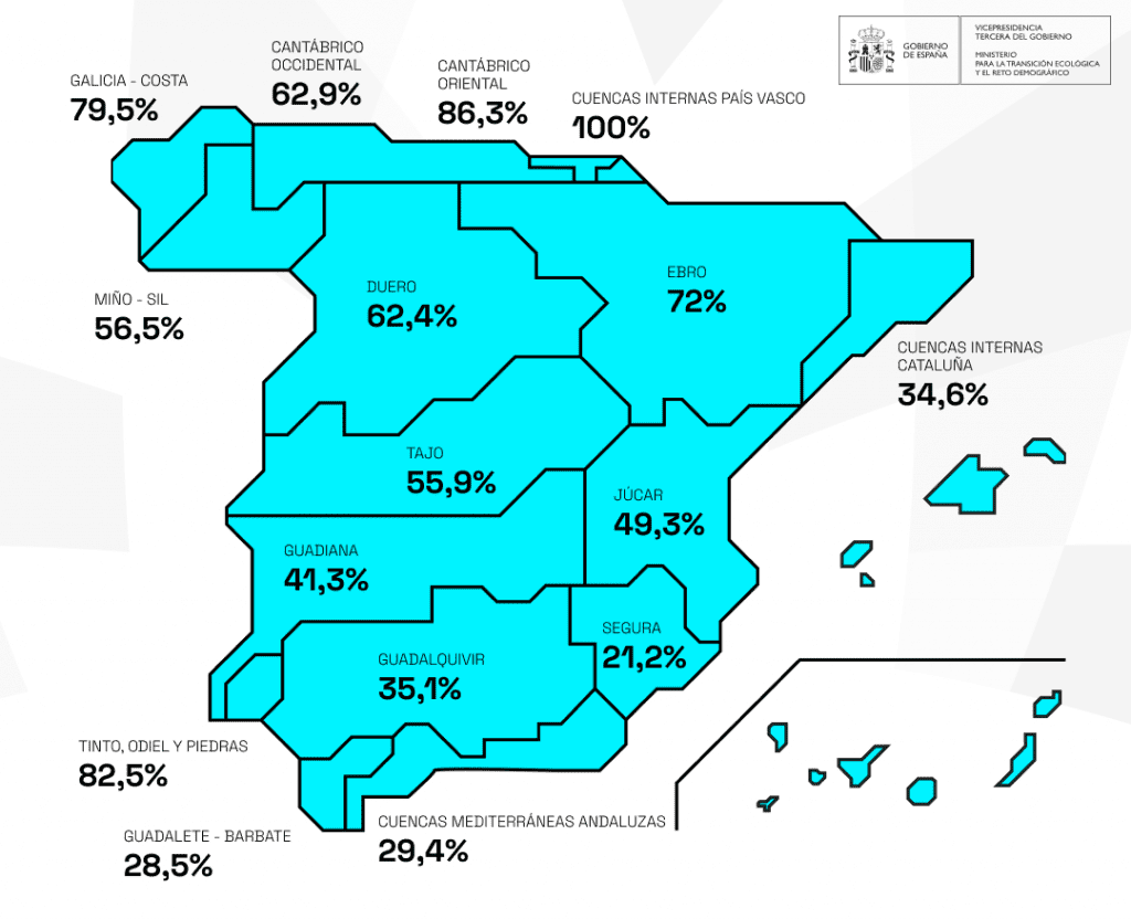 Según informa el Ministerio para la Transición Ecológica y el Reto Demográfico, la reserva hídrica se encuentra al 51,5% de su capacidad total. Esta semana ha aumentado en 73 hectómetros cúbicos (el 0,1% de la capacidad total actual de los embalses).