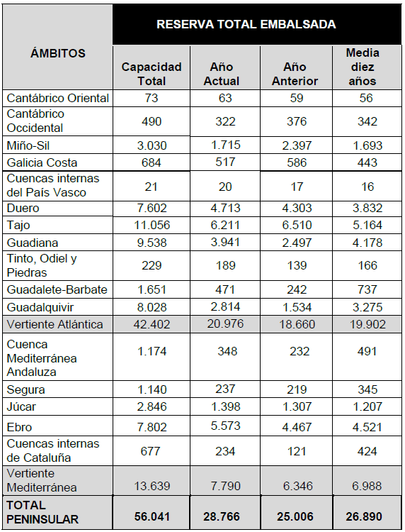 La situación de las cuencas, en hectómetros cúbicos, se detalla en el cuadro adjunto: