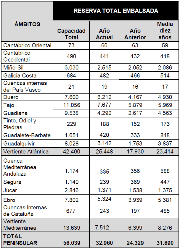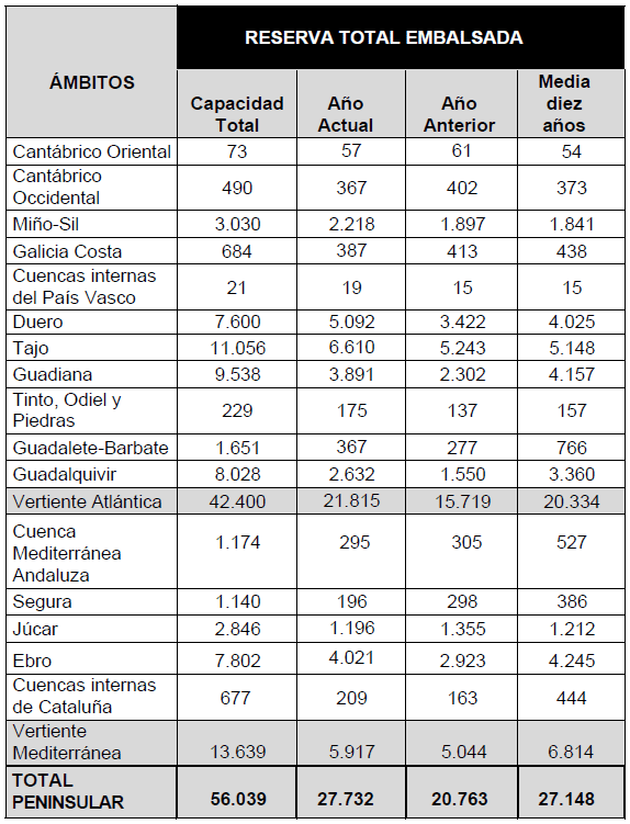 La situación de las cuencas, en hectómetros cúbicos, se detalla en el cuadro adjunto: