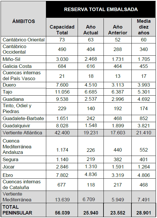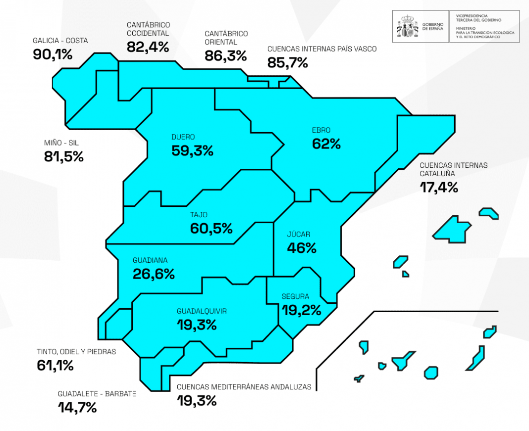 Según informa el Ministerio para la Transición Ecológica y el Reto Demográfico, la reserva hídrica española ha aumentado y se encuentra al 46,3% de su capacidad total. Esta semana se han añadido 319 hectómetros cúbicos (el 0,6% de la capacidad total actual de los embalses). De esta manera, el almacenamiento de agua ha llegado a 25.940 hectómetros cúbicos (hm³).