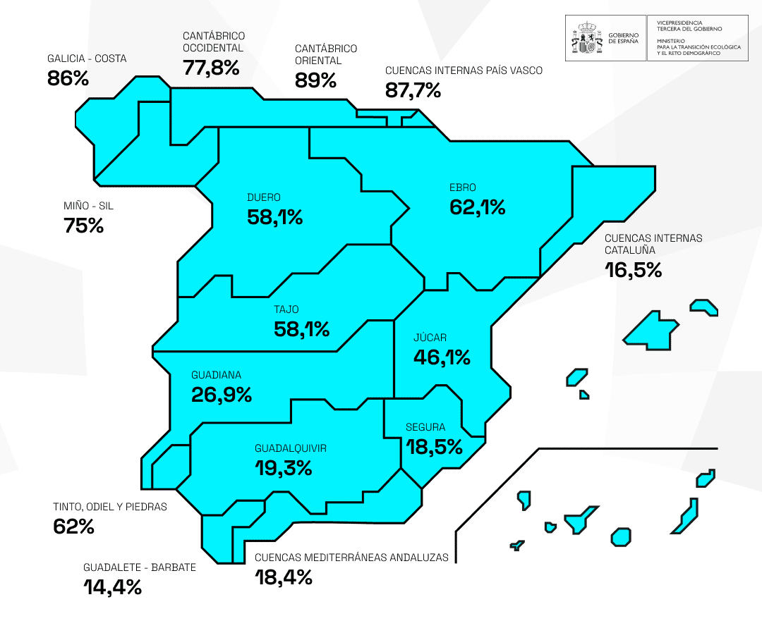 Según informa el Ministerio para la Transición Ecológica y el Reto Demográfico, la reserva hídrica española ha disminuido ligeramente y se encuentra al 45,2% de su capacidad total. Esta semana ha disminuido en 342 hectómetros cúbicos (el 0,6% de la capacidad total actual de los embalses). De esta manera, el almacenamiento de agua se encuentra en 25.356 hectómetros cúbicos (hm³).