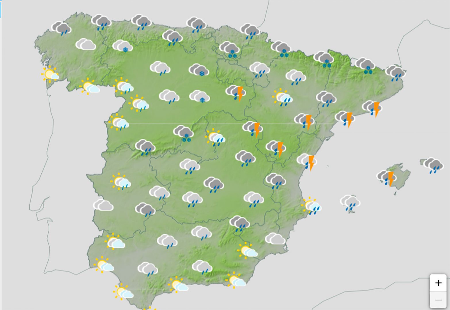 El jueves las precipitaciones quedarán restringidas a la mitad norte y Baleares, ya de menor intensidad que el miércoles salvo en el extremo nordeste y medio Ebro, donde seguirán siendo intensas, y con la cota de nieve subiendo ligeramente.