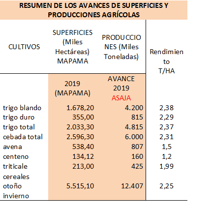 Según los cálculos de Asaja, la cosecha de cereales se verá reducida en un 37% respecto a la cosecha recogida en 2018. Por cultivos, se espera una producción de 4,2 millones de toneladas en trigo blando; 815.000 toneladas en trigo duro; 6 millones de toneladas en cebada; 807.000 toneladas de avena; 160.000 toneladas de centeno y 425.000 toneladas de triticale.