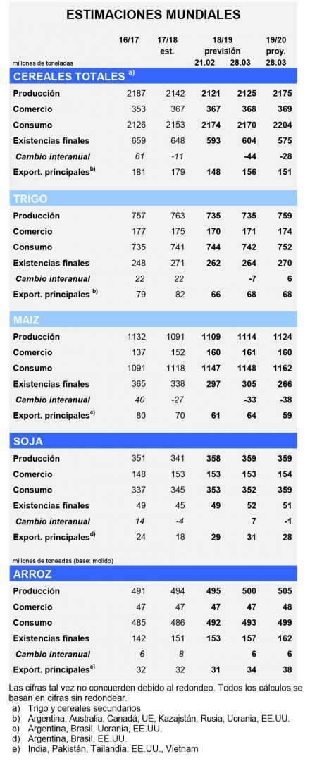 La producción mundial de cereales totales descendió en 17 millones de toneladas en 2018/19, para situarse en 2,125 m., dado que la cosecha más abundante de maíz (+24 m.) se vio superada por la caída de la producción de trigo (-29 m.), cebada (-4 m.) y otros cereales secundarios. Se espera que el consumo aumente en un 1% y que, reflejando la reducida oferta, las existencias de cereales totales (conjunto de campañas locales de comercialización) disminuyan en 44 millones de toneladas, alcanzando su nivel más bajo en tres años.
