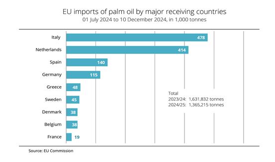 Según un estudio de Agrarmarkt Informations-Gesellschaft (mbH), en el período comprendido entre el 1 de julio de 2024 y el 10 de diciembre de 2024, la UE importó poco menos de 1,4 millones de toneladas de aceite de palma, lo que representa una disminución del 16% con respecto al mismo período de 2023. El mayor descenso se produjo en España, que redujo sus importaciones a más de la mitad, hasta 140.000 toneladas.