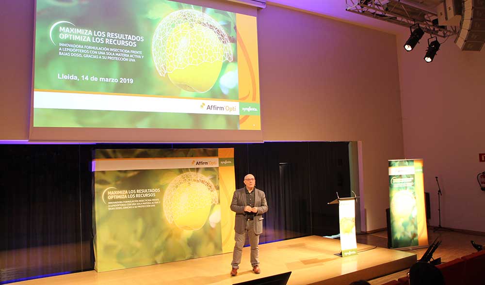 El Palacio de Congresos de Lérida ha sido el lugar elegido por Syngenta para presentar su nuevo insecticida Affirm Opti, una innovadora solución de aplicación foliar para el control de lepidópteros en manzano que, con una sola materia activa, ha demostrado su alta eficacia a bajas dosis gracias a la tecnología que le confiere su protección contra los rayos uva.