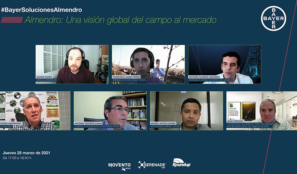 Bayer ha celebrado un webinar bajo el título ‘Almendro: una visión global del campo al mercado’, con el principal objetivo de dar a conocer los beneficios de sus nuevas soluciones para cultivos, especialmente en el almendro. El encuentro contó con cerca de 510 asistentes de España y Portugal, que lo pudieron seguir a través de los canales de Youtube y Facebook de Bayer Crop Science España, así como a través de Twitter. El webinar fue todo un éxito en participación y seguimiento mediante el ‘hashtag’ #BayerSolucionesAlmendro.