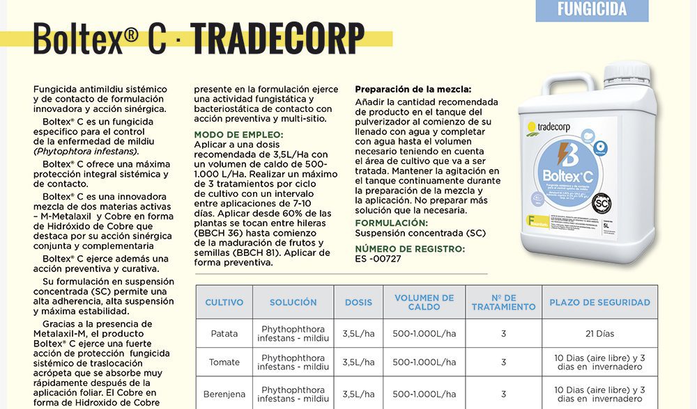Boltex® C se aplica en pulverización foliar con actividad protectora y de contacto. Está indicado para el control de Phythophthora infestans en patata, tomate y berenjena.