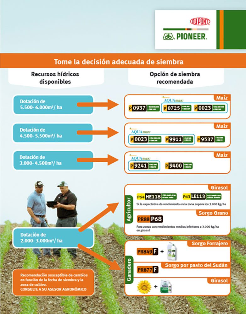 Si no lloviera, tendríamos que pensar en alternativas. Para eso creamos el año pasado nuestro Plan P, de Pioneer. El Plan P encierra todas las alternativas rentables de cultivo en función de la dotación de agua disponible en el momento de la siembra. Así pues, dependiendo de los recursos, podemos sembrar maíz de ciclo medio (el normal en nuestra zona), de ciclo corto, o para ensilado.