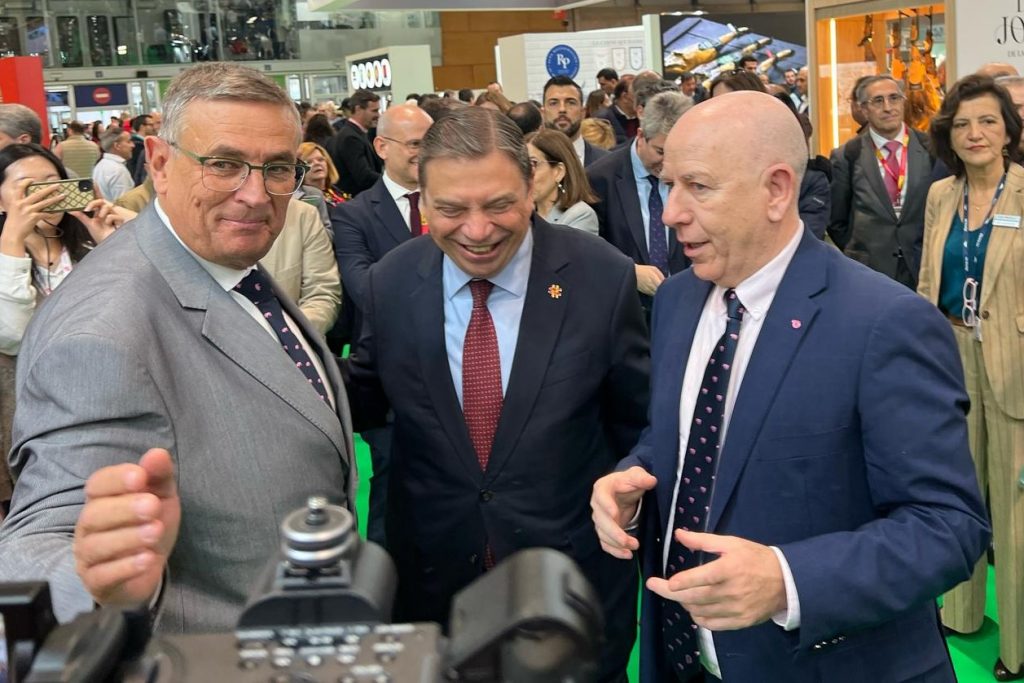 El presidente y el director de INTERPORC, Manuel García y Alberto Herranz, respectivamente, recibieron, en el primer día de feria, la visita del ministro de Agricultura, Pesca y Alimentación, Luis Planas, y del consejero de Agricultura de Aragón, Javier Rincón, quienes mostraron su apoyo al sector y subrayaron su importancia estratégica.