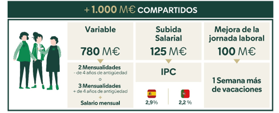 5.000 nuevos puestos de trabajo y más de 1.000 millones compartidos con la plantilla Mercadona, una vez más, ha sido pionera en la adopción de iniciativas para consolidar una plantilla con empleo estable y de calidad. Ejemplo de ello es la mejora de la jornada laboral, con una semana más de vacaciones, la consolidación de poder adquisitivo, con el incremento de IPC, o su política de retribución variable, con el reparto de 780 millones de euros en primas por objetivos, concretamente dos mensualidades a los trabajadores con menos de 4 años y tres mensualidades a los que superan esta antigüedad (70% de la plantilla) y que recibieron en el mes de febrero7.250 €/netos, incluyendo en esta cantidad su salario mensual.