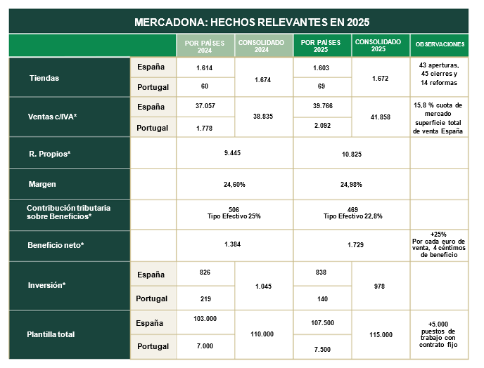 Mercadona, empresa de supermercados físicos y de venta online, ha incrementado en 2025 sus ventas consolidadas un 8%, hasta los 41.858 millones de euros. De este total, 39.766 millones corresponden al negocio de España y los 2.092 restantes al de Portugal, donde Mercadona cuenta con 69 tiendas del total de 1.672 que conformaban la red de supermercados de la compañía. Asimismo, ha mejorado sus ventas en volumen, con un crecimiento del 4% en kilitros (kilos-litros), hasta los 15.067 millones.