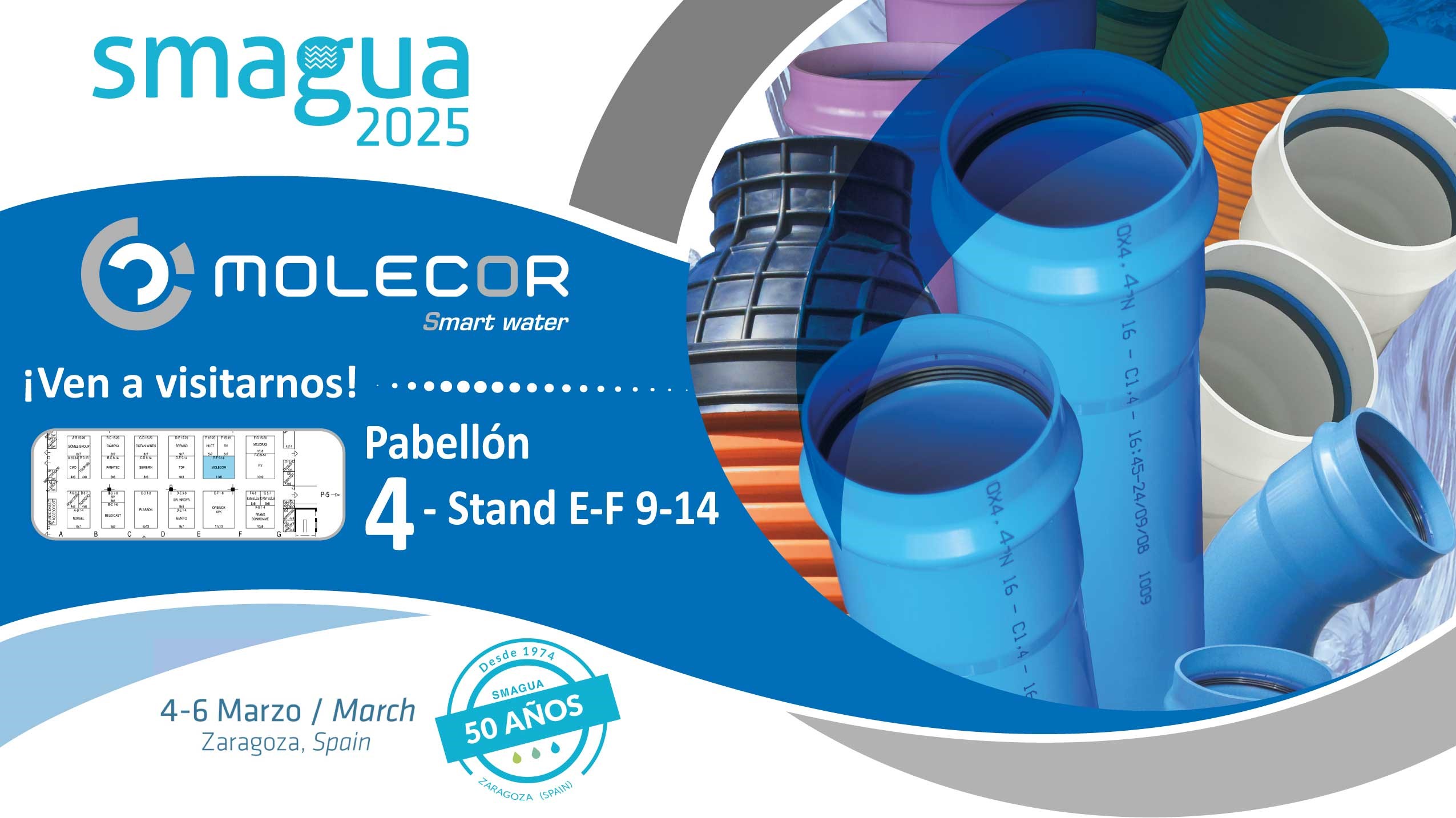 Molecor vuelve un año más a participar en este evento consolidado como uno de los certámenes de referencia del sector del agua. Para esta nueva edición, la empresa contará con un espacio expositivo de más de 80 m2, reforzando así su presencia en el evento. El stand de Molecor, estará localizado en el Pabellón 4 – Stand E-F 9-14, donde todos los asistentes interesados podrán conocer su amplia gama de productos para aplicaciones de abastecimiento (TOM®, TR6® y ecoFITTOM®), saneamiento (SANECOR®) y edificación (Sistema de Evacuación Insonorizada AR®).