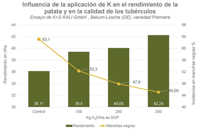 El gráfico que acompaña a este texto muestra un ensayo de campo en Alemania. En dicho ensayo se ha probado el efecto del potasio (en forma de sulfato) en el rendimiento y en la incidencia sobre las manchas negras.