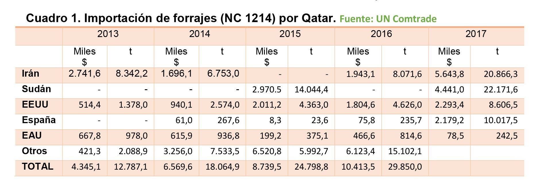 Antes del conflicto diplomático, Qatar se abastecía de sus vecinos Arabia Saudita y Emiratos Árabes casi en su totalidad: productos cárnicos, frutas y hortalizas. A raíz del conflicto, ha tenido que buscar nuevos socios comerciales para cubrir el consumo en el sector alimentario en general. La producción de forrajes nacional es totalmente henificada (segada y secada al sol), de baja calidad y de poco control, por lo que dependen de las importaciones de EEUU, Sudán, Irán, España Sudáfrica, entre otros países.