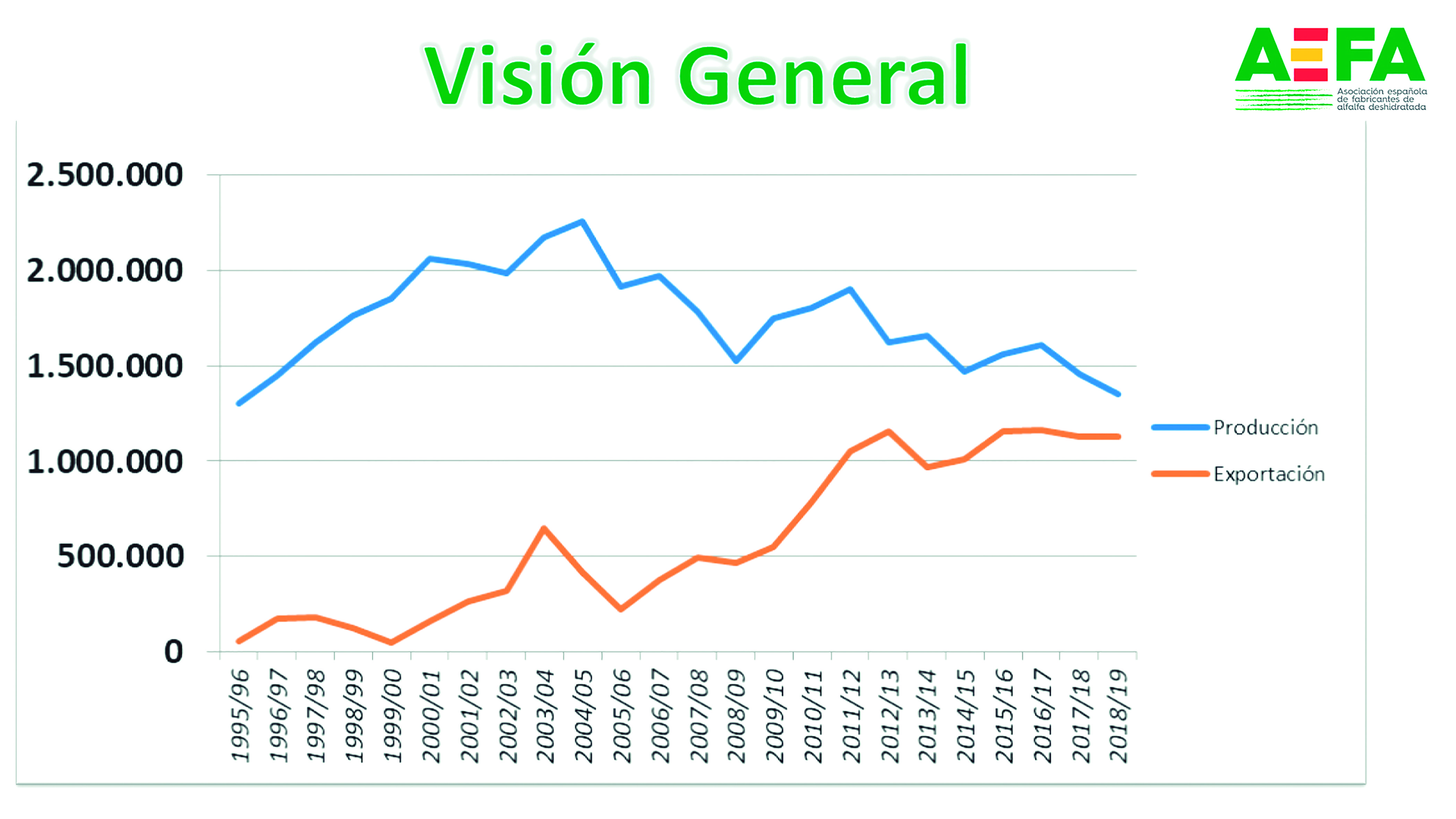 La producción de forrajes deshidratados en España en 2018/19, ha sido la más baja de los últimos años por la menor superficie cultivada y por las condiciones prolongadas de sequía. El consumo nacional sigue flojo por la fuerte oferta de cereales a precios competitivos, unido a los incrementos autorizados de soja de EEUU a la UE, lo que hace más complicado aumentar el consumo nacional. La crisis del sector lácteo de los últimos años se une a la escasa demanda de forrajes deshidratados y en especial para la alfalfa, que representa el 85% de los forrajes.