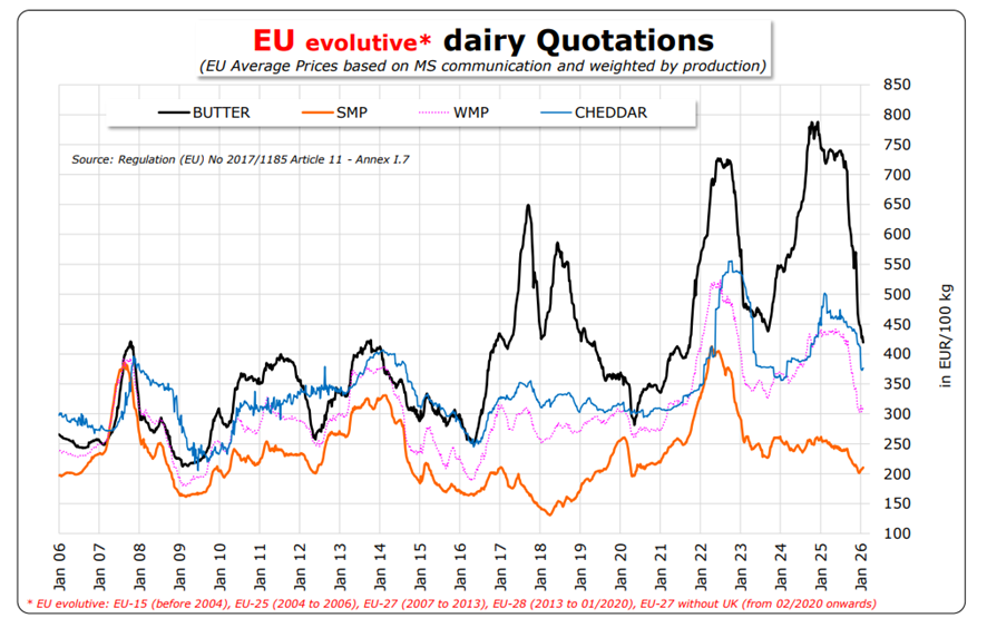 Los últimos datos publicados por la Comisión Europea, a través del Milk Market Observatory, y que recoge la nueva edición del barómetro del sector lácteo de FeNIL, muestran que, a partir del segundo semestre de 2025, se produjo una corrección significativa en los precios de las principales commodities lácteas en la Unión Europea, con descensos especialmente acusados en referencias como la mantequilla y las leches en polvo. Esta evolución se ha ido trasladando progresivamente al precio de la leche pagado a los ganaderos en los distintos Estados miembros, reflejando un proceso de reequilibrio entre oferta y demanda.