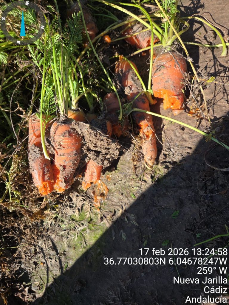 A mediados de febrero, tras varios episodios de lluvias persistentes, la situación en el campo andaluz era crítica. En la provincia de Cádiz, zonas como Jerez de la Frontera y El Puerto de Santa María registraban parcelas completamente anegadas, con daños severos en uno de los cultivos más sensibles al encharcamiento: la zanahoria.