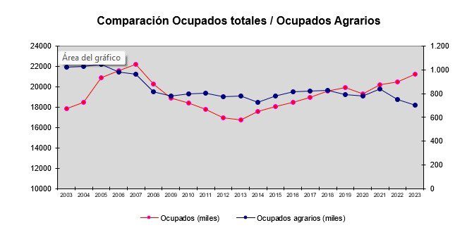 El número de Unidades de Trabajo Agrario (UTAs) en el sector está un 6,6% por debajo de la media de los últimos 5 años, con acentúa la significativa pérdida de activos en 20 años (- 215.000 UTA). Como se puede observar en el siguiente gráfico, si bien la tendencia del número de ocupados de la rama agraria hasta 2007 fue más negativa que la de los ocupados totales, la pérdida de ocupados desde ese año fue menos pronunciada que el resto de los sectores económicos, pero en los últimos años, hay un claro estancamiento en la evolución en la agricultura y ganadería.