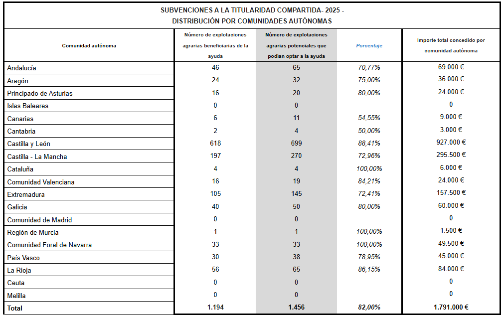 El Ministerio de Agricultura, Pesca y Alimentación concede ayudas por 1,79 millones de euros a 1.194 explotaciones agrarias de titularidad compartida. Estas ayudas constan de una cuantía máxima para 2025 de 1.500 por entidad, antes de que finalice el año, según resolución definitiva publicada en sede electrónica.