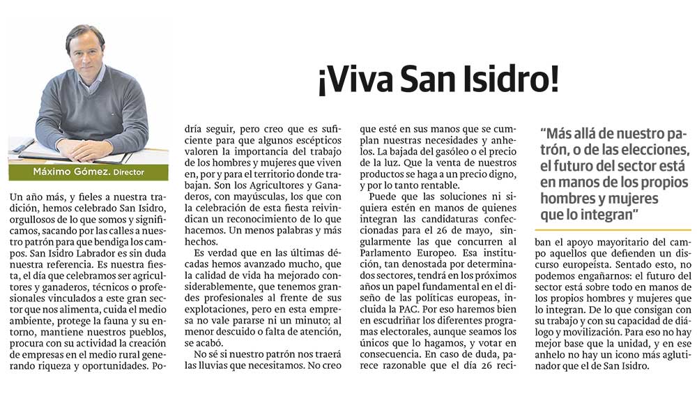 Un año más, y fieles a nuestra tradición, hemos celebrado San Isidro, orgullosos de lo que somos y significamos, sacando por las calles a nuestro patrón para que bendiga los campos. San Isidro Labrador es sin duda nuestra referencia. Es nuestra fiesta, el día que celebramos ser agricultores y ganaderos, técnicos o profesionales vinculados a este gran sector que nos alimenta, cuida el medio ambiente, protege la fauna y su entorno, mantiene nuestros pueblos, procura con su actividad la creación de empresas en el medio rural generando riqueza y oportunidades. Podría seguir, pero creo que es suficiente para que algunos escépticos valoren la importancia del trabajo de los hombres y mujeres que viven en, por y para el territorio donde trabajan.