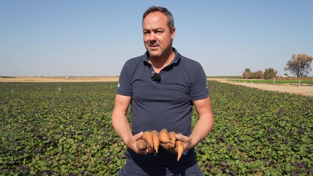 Marco Román, agricultor en Aznalcázar (Sevilla) tiene una explotación en la que siembran boniato ecológico, “en total sembraron entre 80 y 100 hectáreas y producimos unas 4.000 toneladas de boniato”. Normalmente este cultivo se siembra entre los meses de marzo-abril hasta junio-julio, aunque “este año se ha sembrado mucho boniato tardío por el tema de las lluvias, por eso le queda como un mes todavía para empezar a cosechar”, asegura el agricultor.