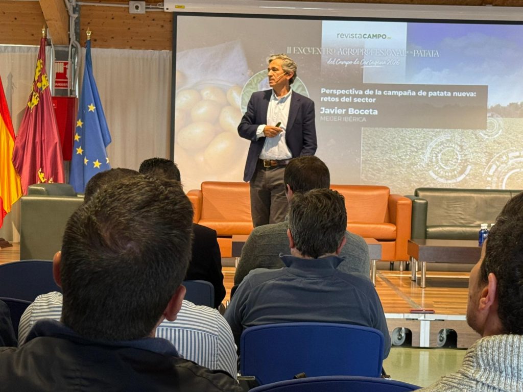 Seguidamente, Javier Boceta, de Meijer Ibérica, presentó la ponencia “Perspectiva de la campaña de patata nueva, retos del sector”. Y reconoció que para él “el campo de Cartagena significa el inicio del año”. En su análisis, repasó la evolución de la superficie cultivada en España y los cambios recientes en distintas zonas productoras, ofreciendo una visión global del mercado. Además, explicó cómo interactúan la producción nacional, las importaciones y exportaciones, y cómo estas variables influyen en el desarrollo de la campaña y en la distribución de la oferta a lo largo del calendario comercial. En uno de sus análisis señalaba que “España debe intentar frenar la entrada de patata vieja en mayo”.