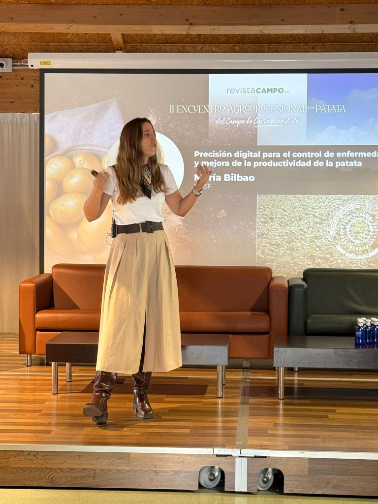 La jornada comenzó con la intervención de María Bilbao, de BASF, quien presentó la ponencia “Precisión digital para el control de enfermedades y mejora de la productividad de la patata”, centrada en el uso de herramientas tecnológicas para optimizar el cultivo. «Usar un buen producto, en el momento correcto y con una buena aplicación», señalaba.