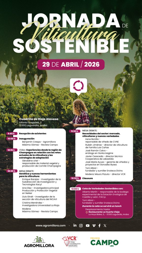 El presente y el futuro del viñedo será el hilo conductor de la Jornada de Viticultura Sostenible 2026, que se celebrará en Cuadrilla de Rioja Alavesa, en Laguardia (Álava), el próximo miércoles 29 de abril. Esta cita, organizada por Agromillora-VCR y Revista Campo, reunirá a investigadores, técnicos, viticultores, bodegas y expertos del sector para abordar los retos y oportunidades del cultivo y explotación de la vid, desde la innovación y la responsabilidad medioambiental, fomentando la búsqueda de soluciones conjuntas.