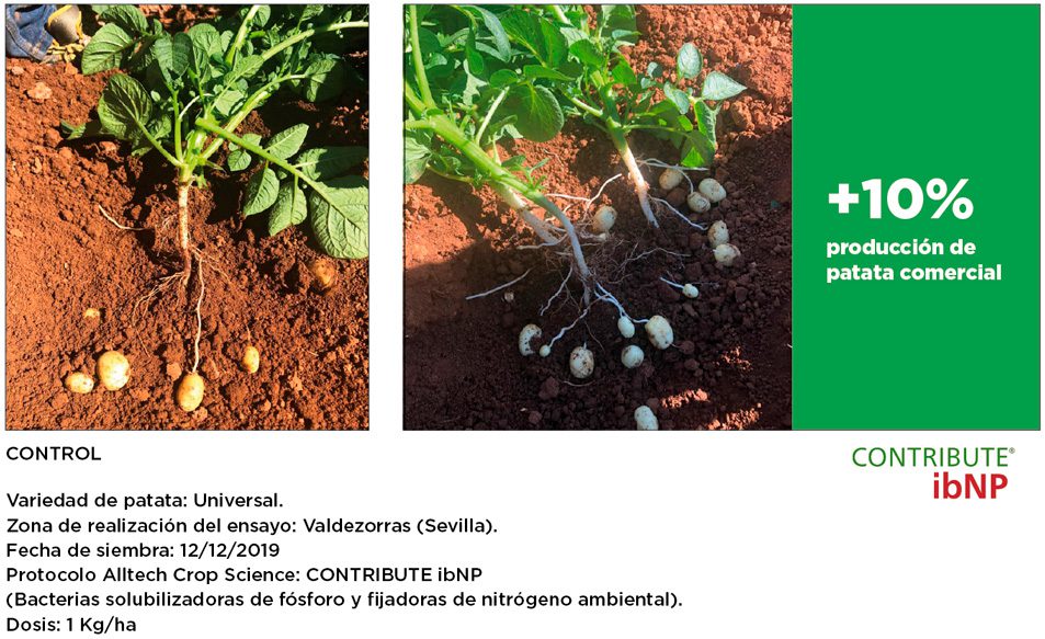 Por otro lado, el fósforo favorece el desarrollo radicular, el número de tubérculos y la concentración de almidón. Además, produce un desarrollo más temprano del cultivo y adelanta la tuberización, lo que es especialmente interesante para los cultivos extratempranos.
