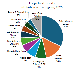 En conjunto, las exportaciones agroalimentarias representaron el 9 % del total de las exportaciones de la UE, que en 2025 ascendieron a 2,6 billones de euros, lo que refleja la relevancia económica del sector.