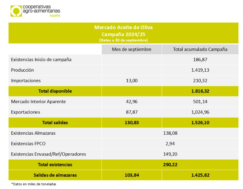 La producción total de campaña sube hasta las 1.419.127,66 toneladas, con los ajustes de final de campaña. Las salidas de aceite al mercado, en septiembre se situarían en el entorno de las 130.829 t. Las salidas acumuladas a la finalización de la campaña son de 1.526.100 t.