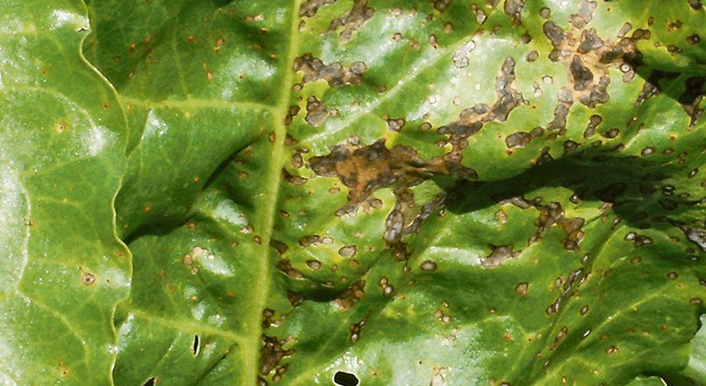 El síntoma característico de la cercospora (Cercospora beticola) es la aparición sobre el limbo de las hojas maduras de numerosas manchas pequeñas, redondeadas, marrones claras, que a veces pueden estar rodeadas de un halo marrón oscuro o rojizo. Cuando el ataque es grave se produce una importante defoliación.