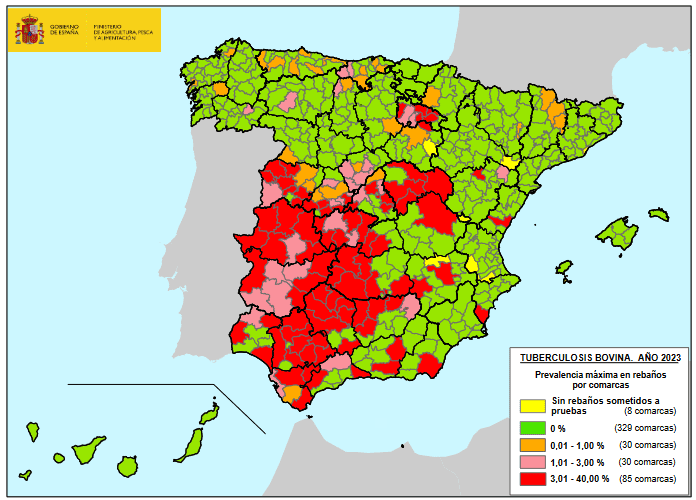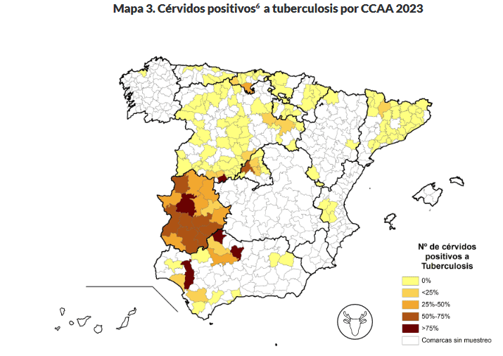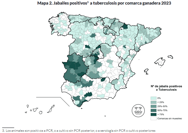 El informe detalla que, de los jabalíes analizados mediante microbiología y serología en 2023, el 12,87% dio positivo en tuberculosis. Sin embargo, en zonas específicas, la prevalencia supera el 50% e incluso el 75%. Estos datos sugieren que el jabalí desempeña un papel clave en la transmisión de la enfermedad al ganado doméstico, especialmente en las regiones del suroeste de la península, donde las tasas de infección en ganado bovino son alarmantes.