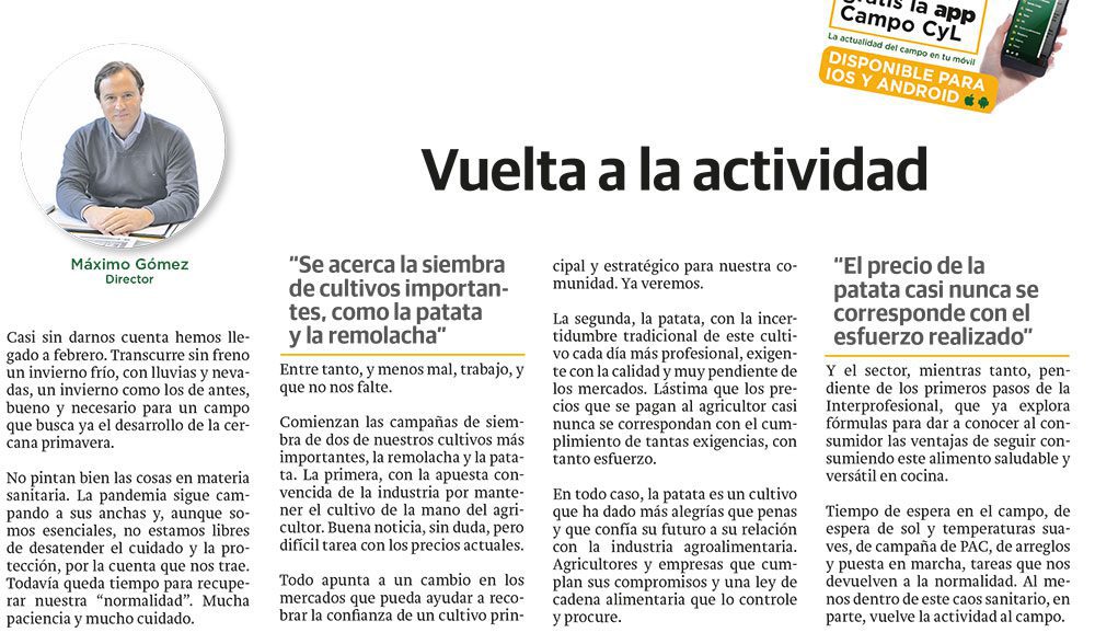 Comienzan las campañas de siembra de dos de nuestros cultivos más importantes, la remolacha y la patata. La primera, con la apuesta convencida de la industria por mantener el cultivo de la mano del agricultor. Buena noticia, sin duda, pero difícil tarea con los precios actuales.