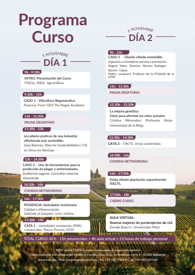 Además, el curso se completa con materiales docentes virtuales disponible para cada asistente. Se tratarán temas sobre a monitorización del suelo y su regeneración, se desarrollará un plan de acción personalizado para el viñedo de cada asistente, se manejarán herramientas tecnológicas avanzadas para optimizar recursos y productos fitosanitarios en la lucha contra enfermedades fúngicas, se hablará sobre los pilares de una industria vitivinícola más sostenible así como el diseño de viñedos sostenibles y los aspectos clave a considerar antes de la plantación.
