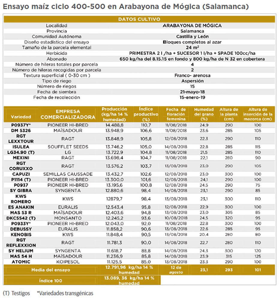 Las variedades más productivas han sido P0937Y y DM 5326 con una producción de 14.488,8 kilos por hectárea y 13.948,9 kilos respectivamente. Destacando también la variedad RGT Lexxtour con un rendimiento de 13.848,9 kilos, no habiendo diferencias significativas entre las siete primeras variedades. Entre las menos productivas están atomic con 11.125,5 kilos, MAS 54 H con 11.236,9 kilos y SY helium con 11.618 kilos. Se han producido importantes diferencias estadísticamente significativas entre las variedades más productivas y las menos productivas.