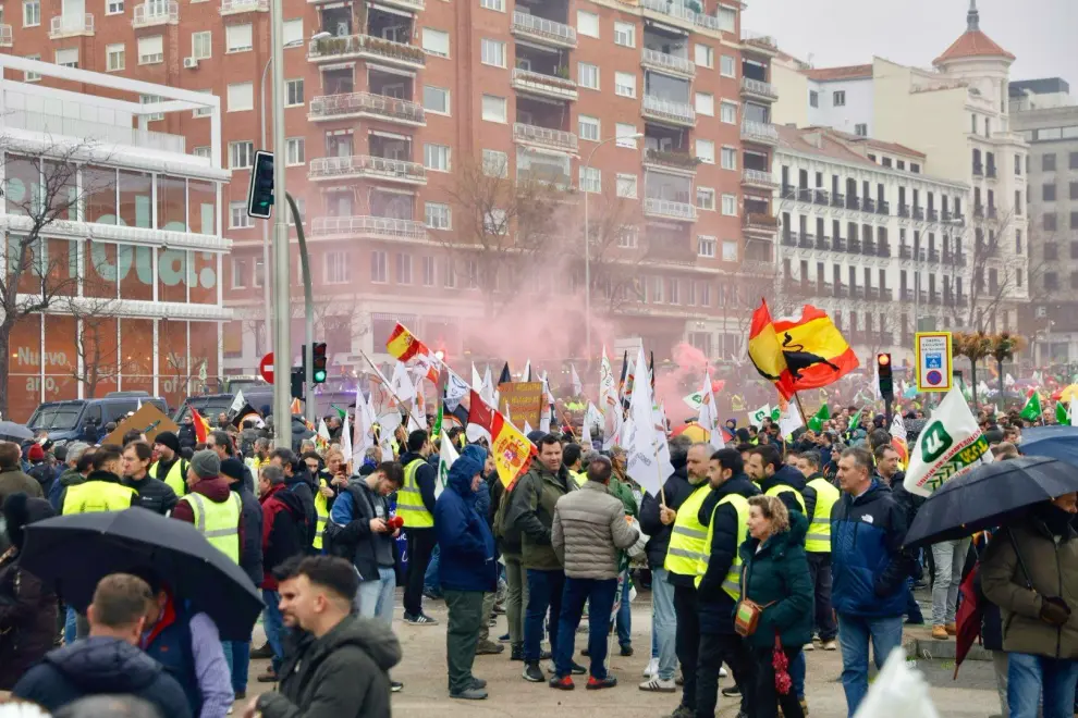 Entre los aplausos espontáneos de muchos madrileños y bajo la lluvia, 500 tractores y más de 10.000 manifestantes han desfilado hacia el centro de la capital para expresar la furia del sector agrícola contra el acuerdo comercial con los países del bloque Mercosur y el recorte de fondos en la Política Agrícola Común (PAC)