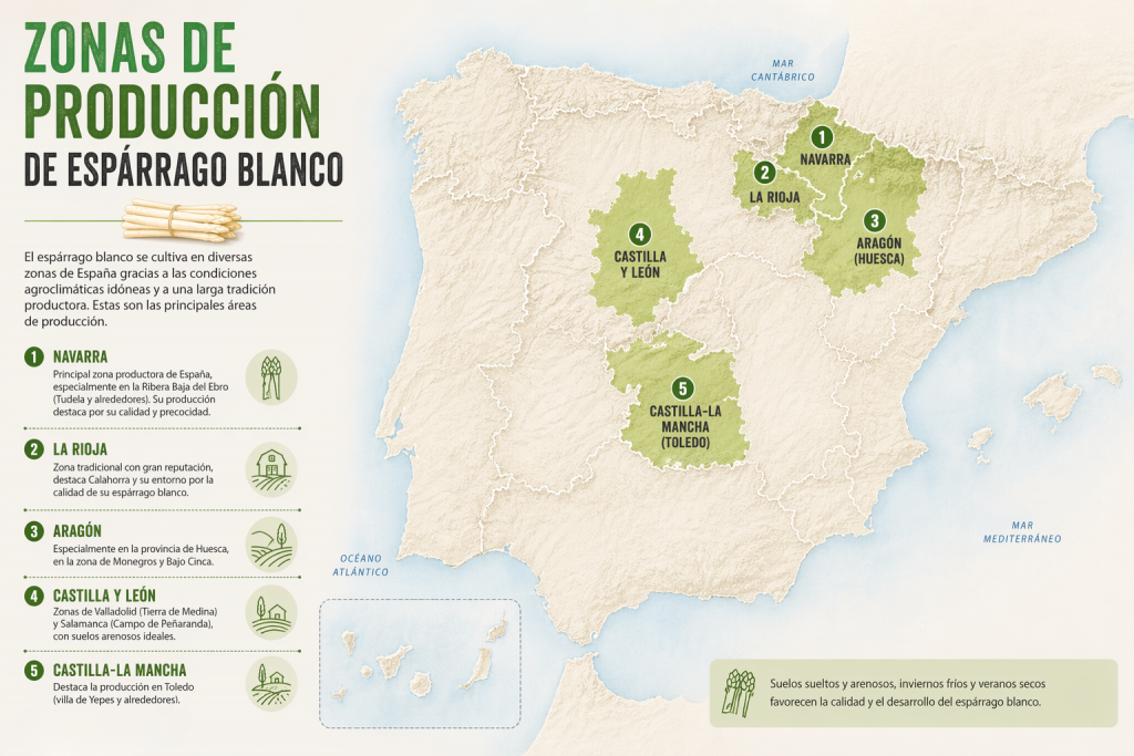 Más allá del eje del Ebro, el espárrago blanco mantiene presencia en otras zonas relevantes del país.