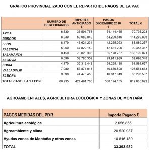 En diciembre de 2018, la Consejería de Agricultura y Ganadería ha transferido a la cuenta de esos 66.295 agricultores y ganaderos de la Comunidad cerca de 388,2 millones de euros correspondientes a las ayudas vinculadas a superficies, entre las que se encuentran el pago básico, el complemento del pago verde y la ayuda directa y específica a jóvenes agricultores, de todas ellas se ha abonado ya el 95%. Asimismo, se ha ingresado ya el 95% del régimen simplificado de pequeños agricultores y el 90% de los pagos asociados a los cultivos de proteaginosas y leguminosas, oleaginosas, legumbres de calidad y remolacha.